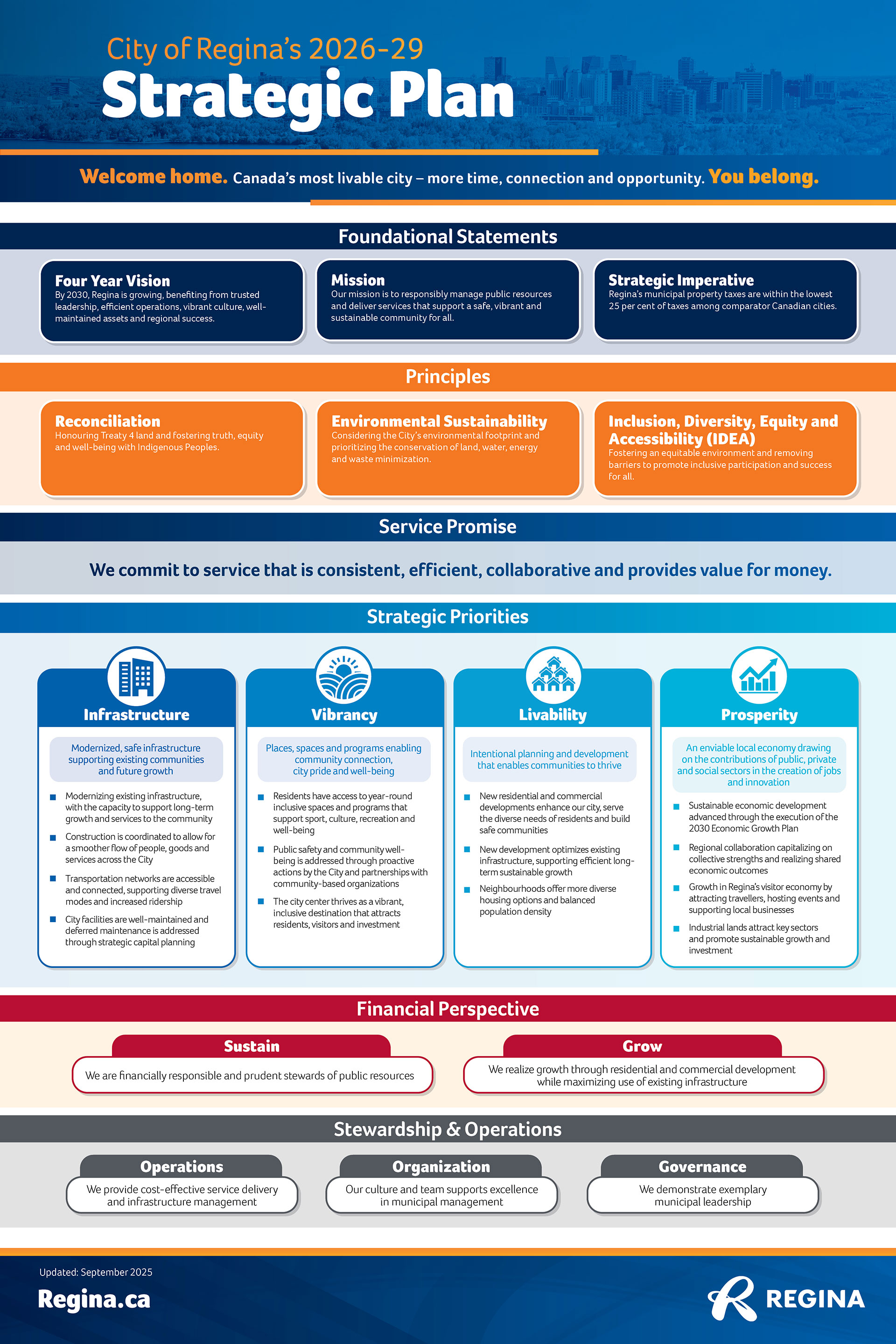 The entire strategic plan, including a detailed balance scorecard with key performance indicators, workplans, and alignment with existing city policy can be found online www.regina.ca, but below is a brief snapshot.